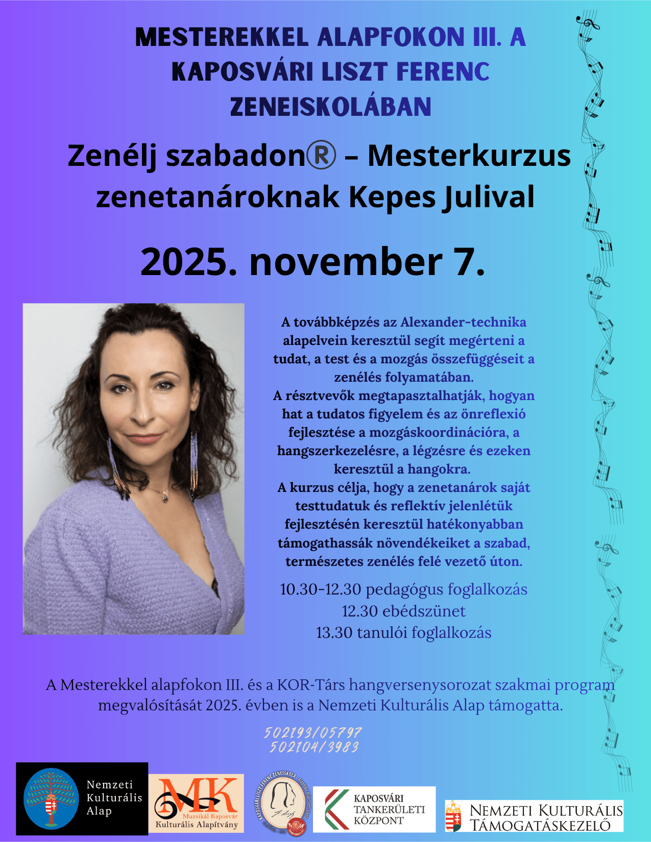 A kurzus célja, hogy a zenetanárok saját testtudatuk és reflektív jelenlétük fejlesztésével hatékonyabban támogathassák növendékeiket a szabad, természetes zenélés felé vezető úton.