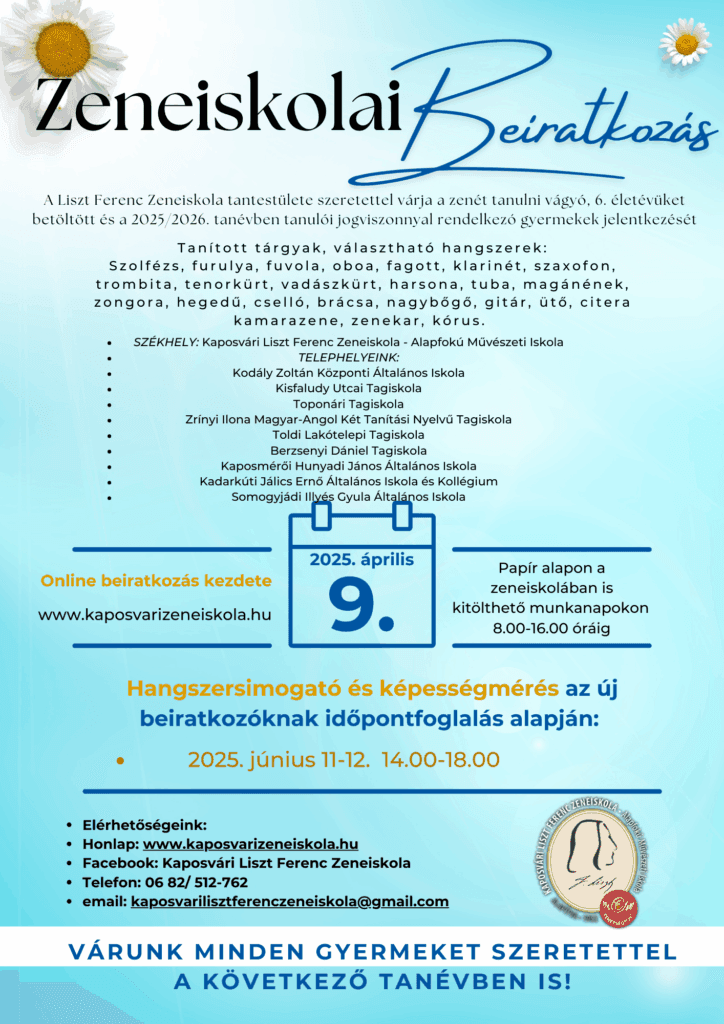 Új tanulóinknak a zeneiskolai tanulmányok megkezdéséhez szükséges szolfézs meghallgatás is, melyre az alábbi linken tudnak időpontot foglalni. Azoknak a növendékeinknek, akik a 2025/2026. tanévben kezdik meg hangszeres tanulmányaikat, hangszeralkalmassági meghallgatásra kell időpontot foglalniuk ugyanezen a linken.